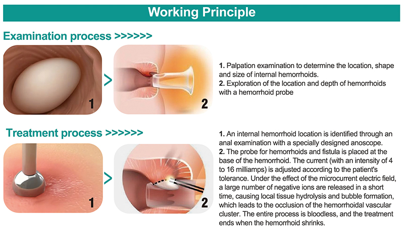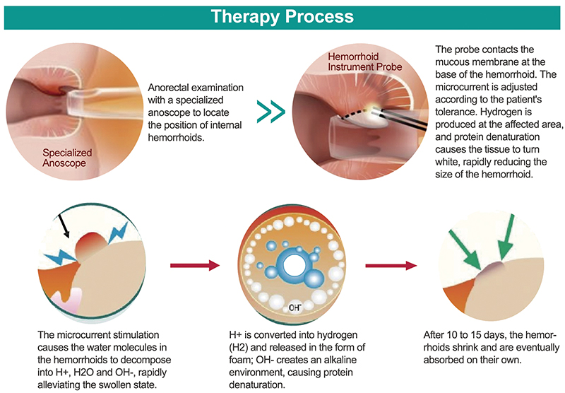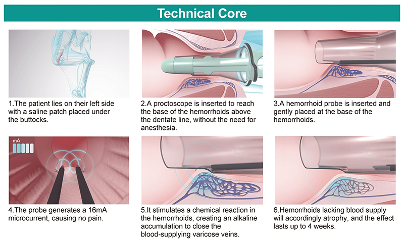 The electrotherapy for hemorrhoids is an innovative and improved physical therapy method based on the traditional Chinese medicine theory of dry hemorrhoid therapy and the theory of microcurrent electrochemistry. It is a painless, non-invasive, and anesthesia-free treatment for internal and mixed hemorrhoids. It is suitable for people with damp-heat descending, qi stagnation and blood stasis, spleen deficiency and qi sinking, and yin deficiency and intestinal dryness. Through the intelligent microcurrent physical therapy device and the specially designed hemorrhoid probe (Yue Su Medical Device No. 20250319), under the action of the microcurrent electric field, it can quickly cause the occlusion of the hemorrhoid vascular clusters, leading to the atrophy of the hemorrhoid body and the cessation of bleeding. This painless, non-invasive, and anesthesia-free characteristic physical therapy truly realizes the new concept of "non-invasive hemorrhoid interruption" without pain.