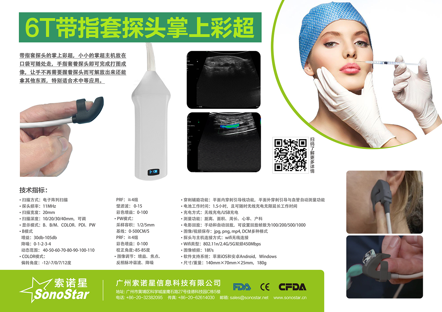 带指套探头的掌上彩超,小小的掌超主机放在口袋可随处走,手指套着探头即可完成打图成像,让手不再需要握着探头而可解放出来还能拿其他东西,特别适合术中等应用