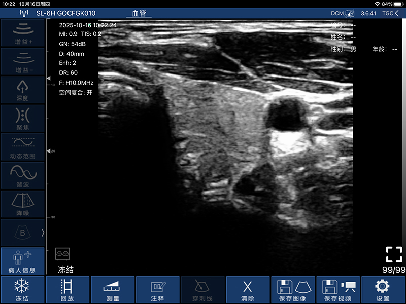 • 穿刺辅助功能:平面内穿刺引导线功能,平面外穿刺引导与血管自动测量功能