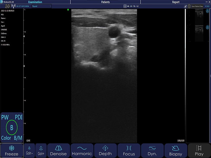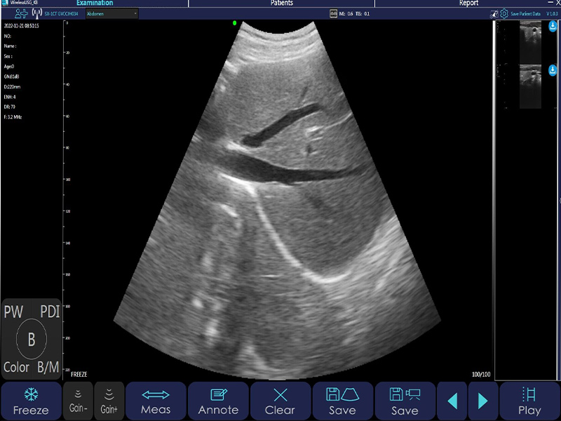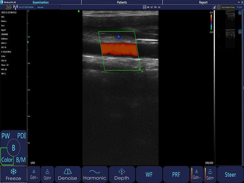 - 图像调节:黑白图像增益、分段增益TGC、动态范围、焦点、深度、反相脉冲谐波、降噪、彩色增益、血流采样框大小、PRF