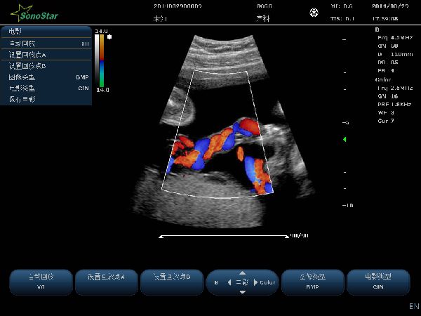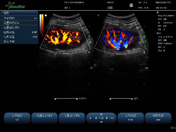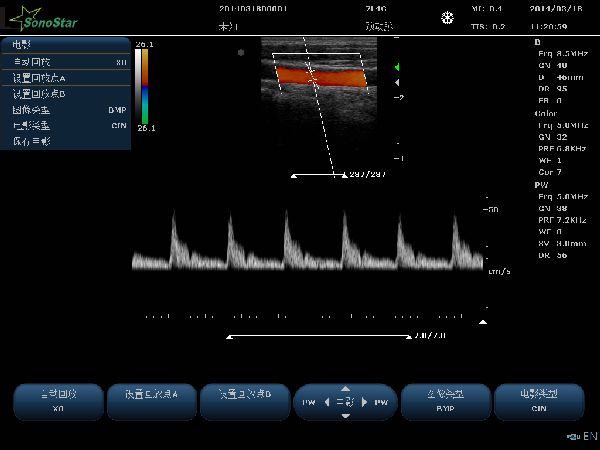 3)Doppler模式常规测量:心率、流速、流速比、阻力指数、搏动指数、手动/★自动包络、加速度、时间、心率