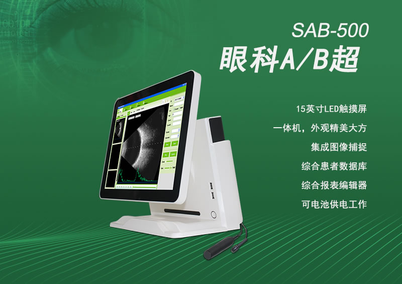 SAB-500眼科A/B超具有正常,玻璃体增强,视网膜观察模式,主要用于诊断眼科眼内疾病,显示病灶的位置、形态范围与周围组织的关系。可诊断玻璃体浑浊,视网膜脱落,框内肿瘤等眼内疾病。A超用于测量前房深度、晶状体厚度、眼轴长度,计算植入人工晶体屈光度数。