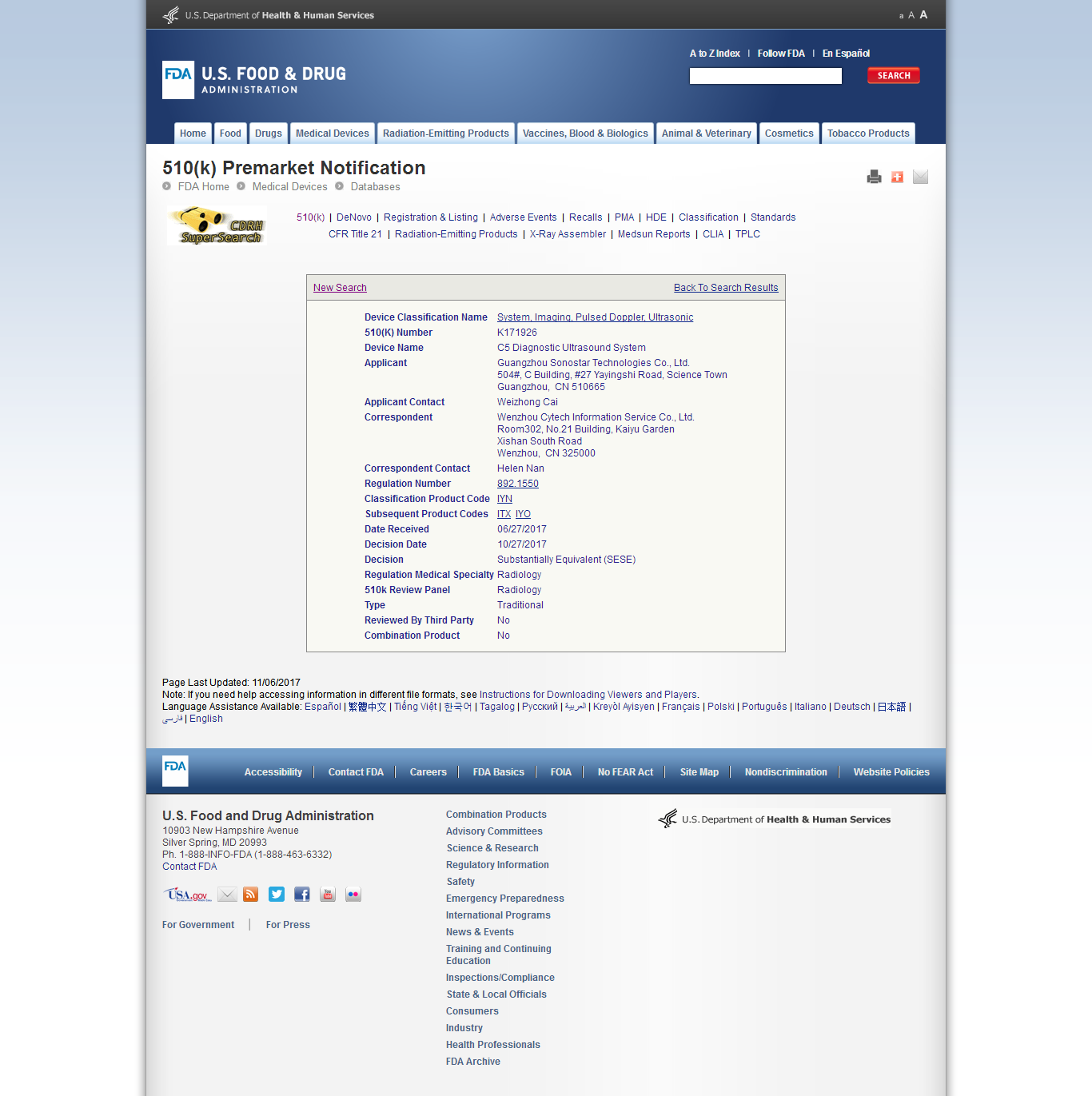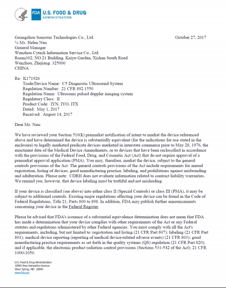 热烈祝贺索诺星产品获得美国FDA认证,首先下来的是便携彩超的510K,下个月无线超声的也可拿到,以及眼超的也会陆续拿到。欢迎合作开拓美国、加拿大等需要FDA认证的市场。